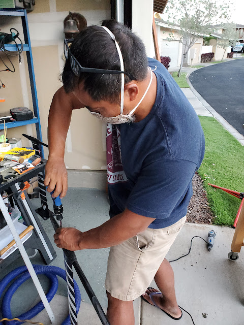 After I got back from foiling, I put more work into the mast repair so I could get it done and out of the garage. I sanded the filled area flush, then went through the 80-120-180-220-320 sanding discs. I went ahead and wet sanded through 400-500-1000 grits. Then I took a bunch of measurements and drilled the pilot holes.