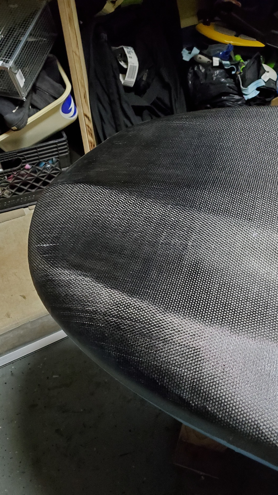 And this is from today - I wet sanded the two spots that had reef rash (on the leading edge of both sides), taped the spots I didn't want filled, then sprayed filler/primer. I'll let this dry overnight then sand it back to a pre-rash state. Then I'll re-tape the wing and get a coat of blue paint on the front - then sand, the clear coat, then wax. I hate hitting bottom.