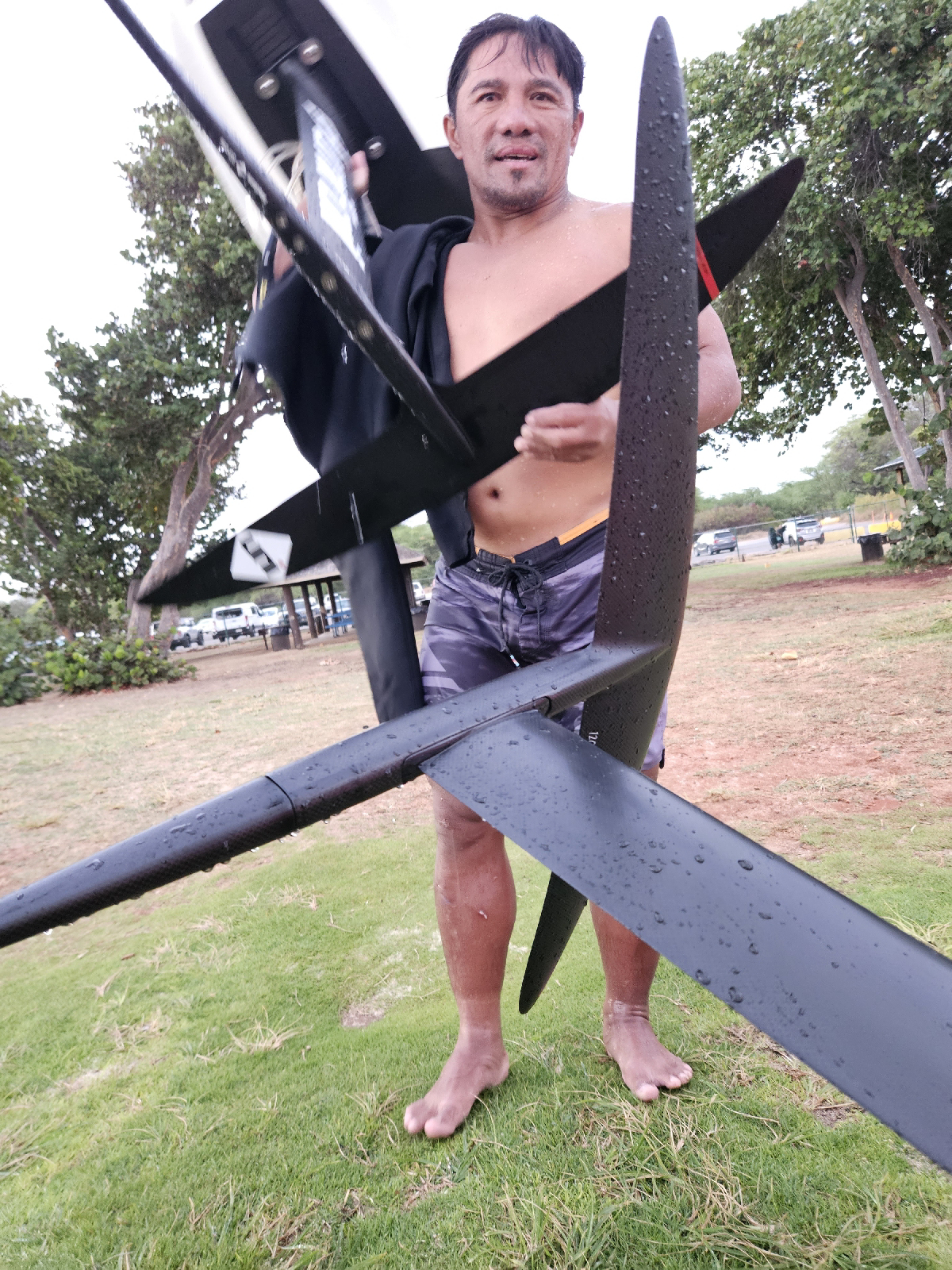 We adjusted the mast position forward a quarter inch - seems to have worked since he was up on foil multiple times. He just needs more practice to get settled in on the foil (instead of the board). Also those first generation GoFoils need a lot of front foot pressure - he was compensating by placing his hands on the rails... maybe we need to pull the mast back a hair.... more practice tomorrow!!!!