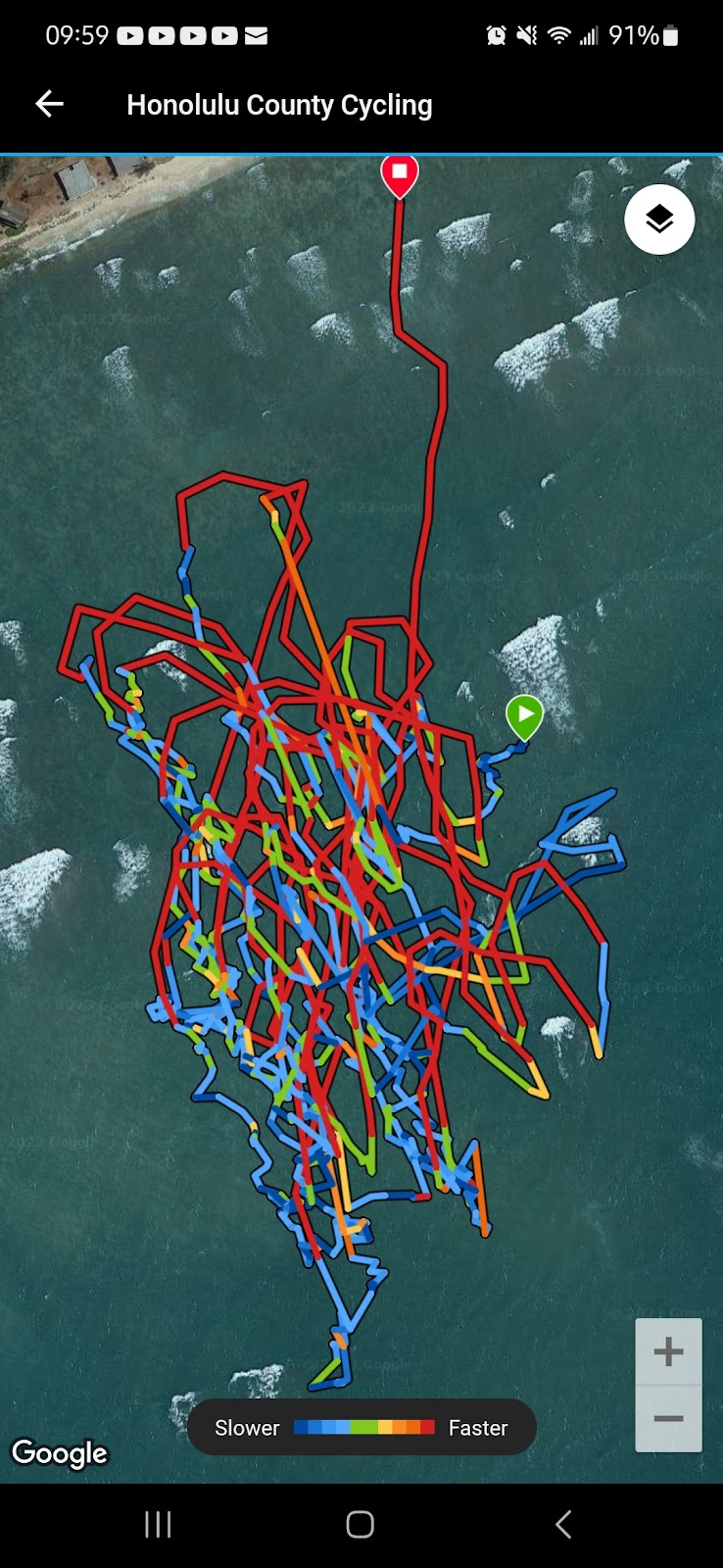 When the wind blows in from the SW (or even the W) small waves roll in to the inside of Hickam Harbor.  If you look on my track, you can see the wiggles on the inside where I was riding the bumps.  On one instance, I'm pretty sure I got the foil out of the water and on to a power slide - I recovered and am now curious about doing this at will.